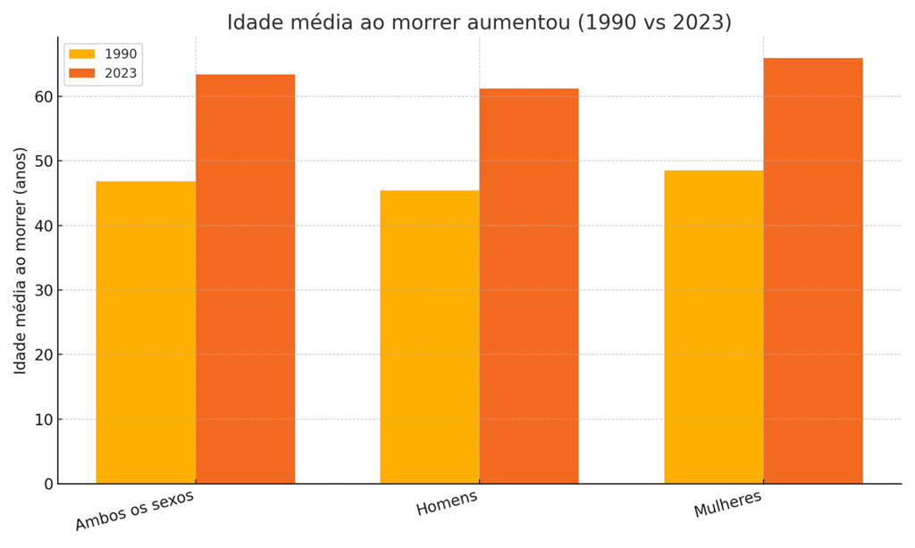 Globalmente, a idade média ao morrer (todas as causas, ambos os sexos) aumentou de 46,8 anos em 1990 para 63,4 anos em 2023. Em 2023, a média foi 61,2 anos para homens e 65,9 anos para mulheres (GBD 2023 CAUSES OF DEATH COLLABORATORS, 2025).