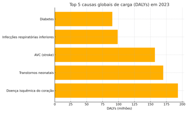 Além de mortes, o GBD mede carga total (morte + incapacidade). Em 2023, as 5 principais causas globais de DALYs foram: doença isquêmica do coração (193 milhões), transtornos neonatais (170 milhões), AVC (157 milhões), infecções respiratórias inferiores (98,7 milhões) e diabetes (90,2 milhões) (GBD 2023 DISEASE AND INJURY AND RISK FACTOR COLLABORATORS, 2025).