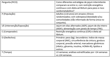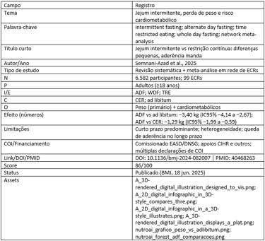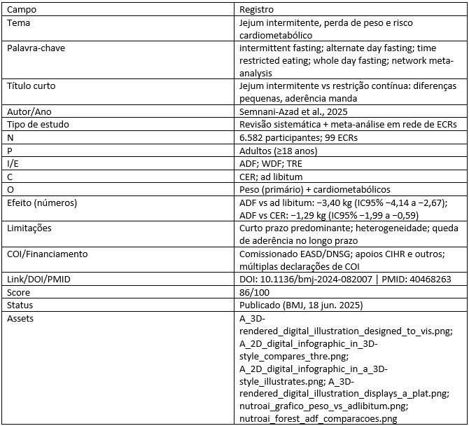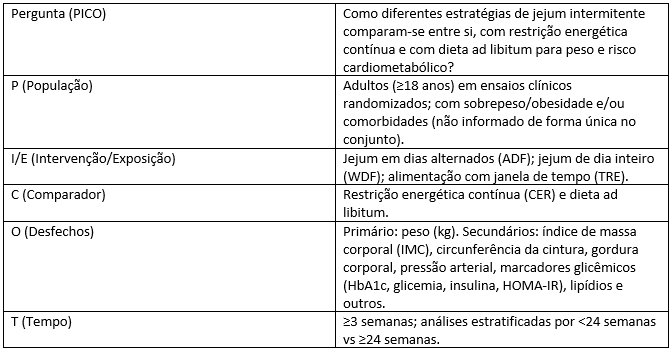 Avaliar os efeitos de diferentes estratégias de jejum intermitente sobre peso corporal (desfecho primário) e sobre outros fatores de risco cardiometabólico (desfechos secundários), comparando-as entre si, com restrição energética contínua e com dieta ad libitum, usando revisão sistemática e meta-análise em rede (Semnani-Azad et al., 2025).